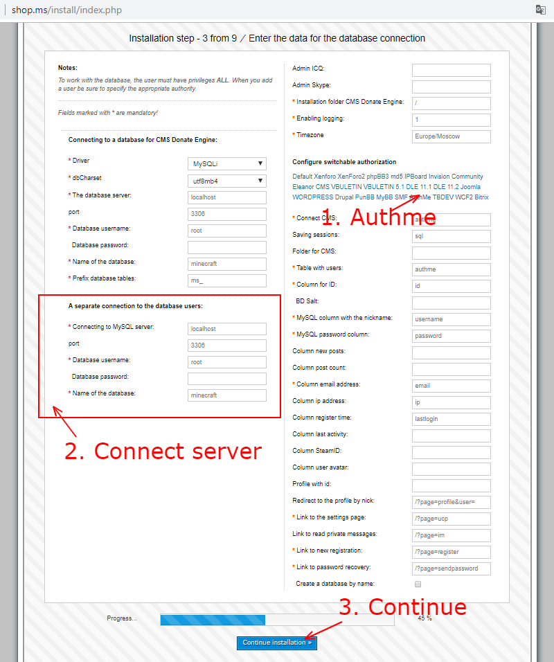 The connection is already built into the installer and at one of the wizard steps you need to select the Authme authorization integration system. In the same step of the installation wizard, enter the data for connecting to the MySQL server. For more information on how to configure the connection, see the screenshot.