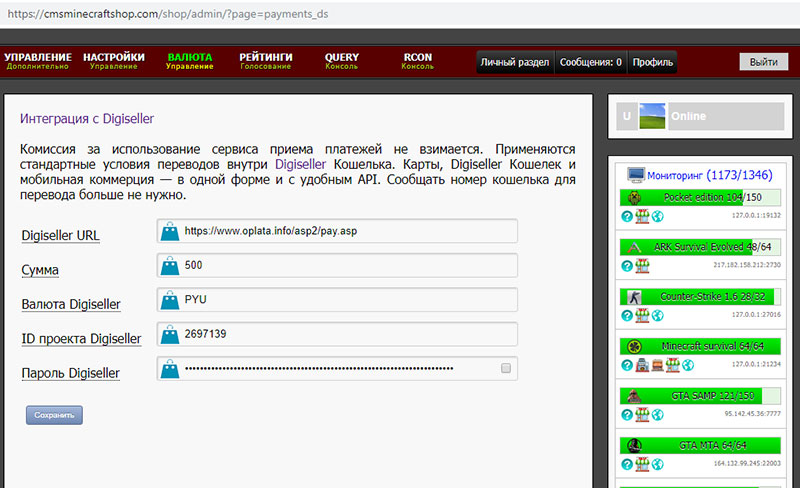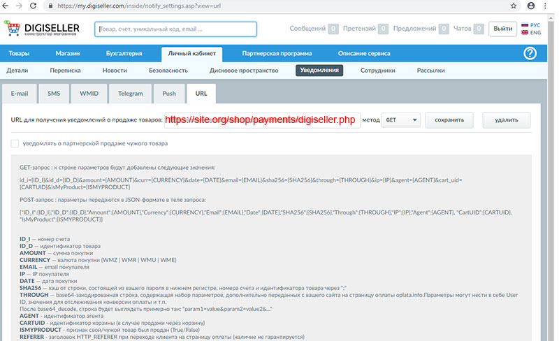 For automatic accrual of donation, you need to configure not complicated sending of notifications. In DigiSeller settings, enter the URL to receive notifications about the sale of goods.