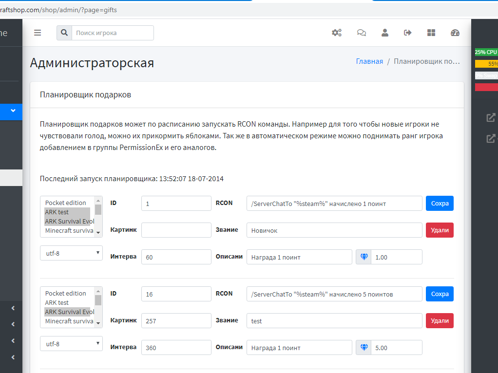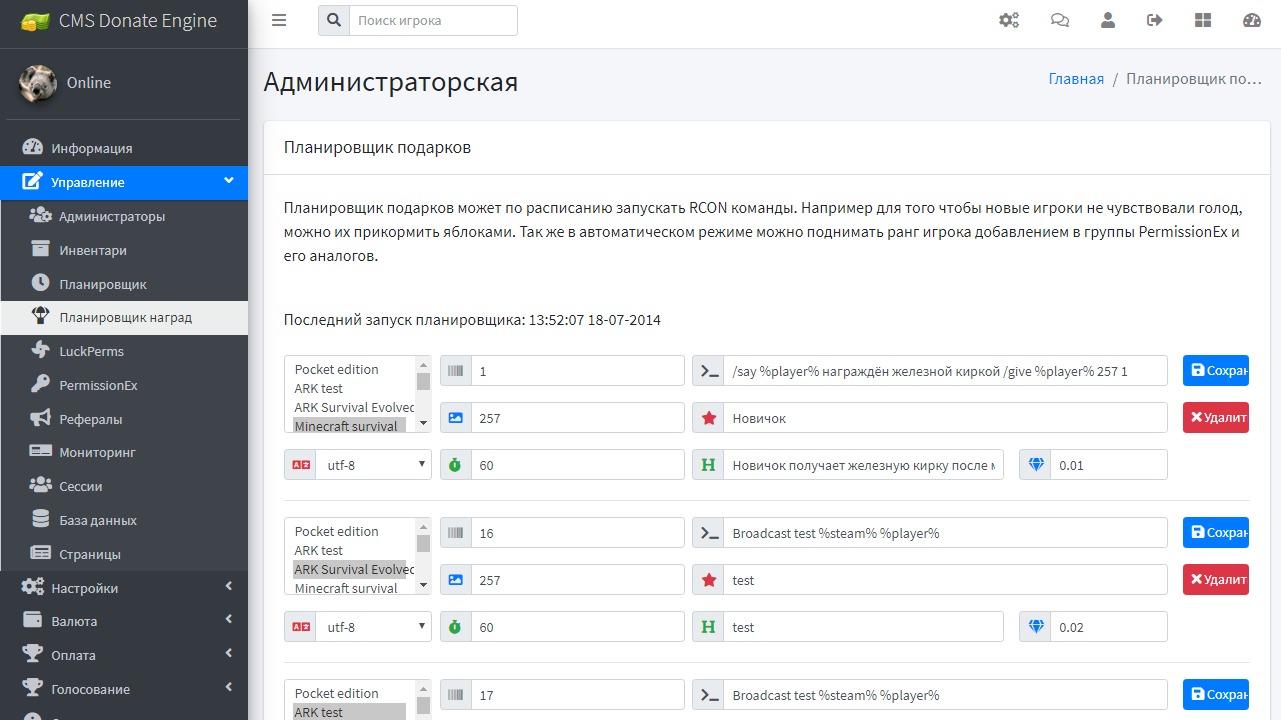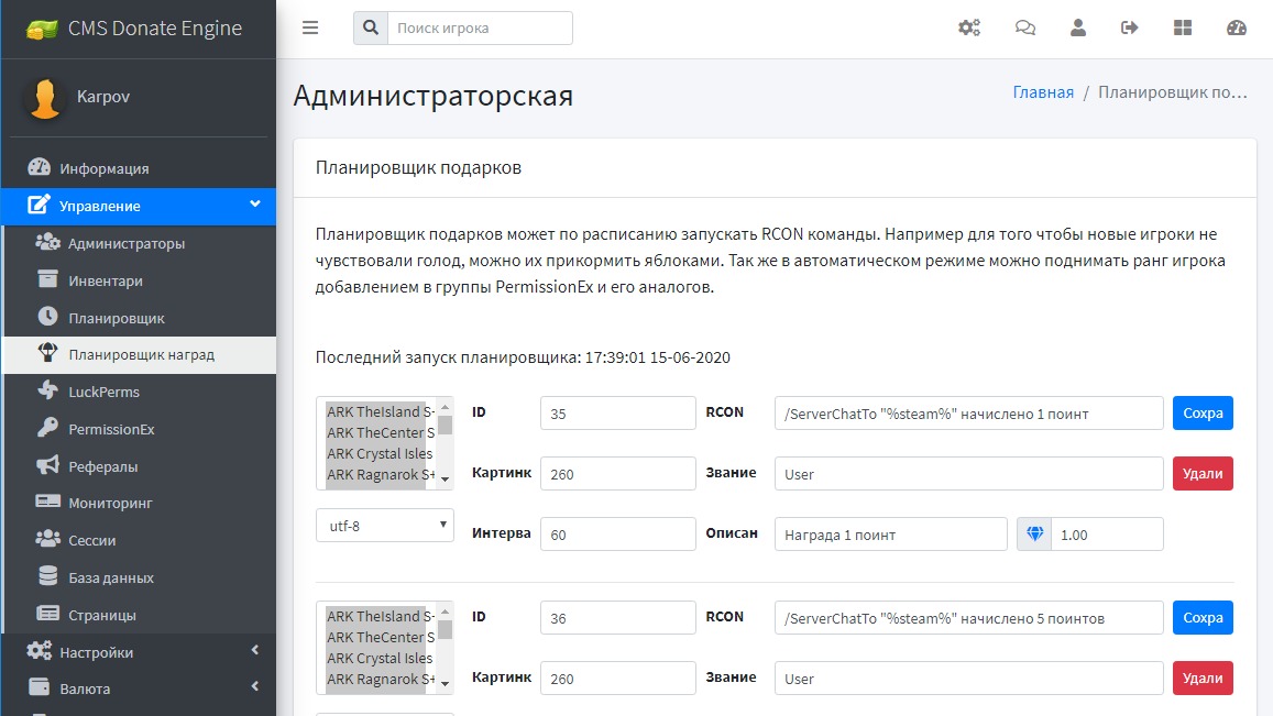 Awards scheduler allows players to receive bonuses in the automatic mode, administrators can optionally configure the server so that players will receive sets of resources and privileges when a certain amount of time on the server.Players will appreciate the attention and help.