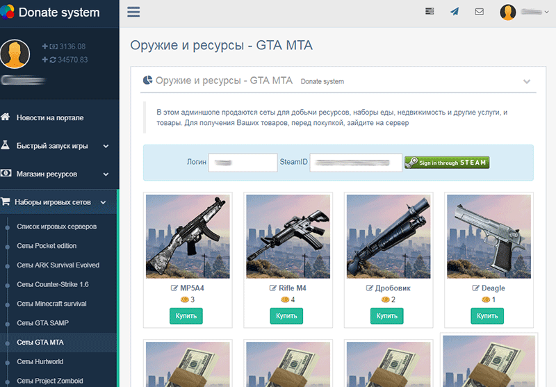 Monetizing GTA MTA San Andreas servers has never been easier! Thanks to the personal account on your site, players in a couple of clicks will be able to buy resources, weapons, money, privileges, licenses and many more useful things, and you will get the lowest Commission from Donat through direct integration with payment systems.