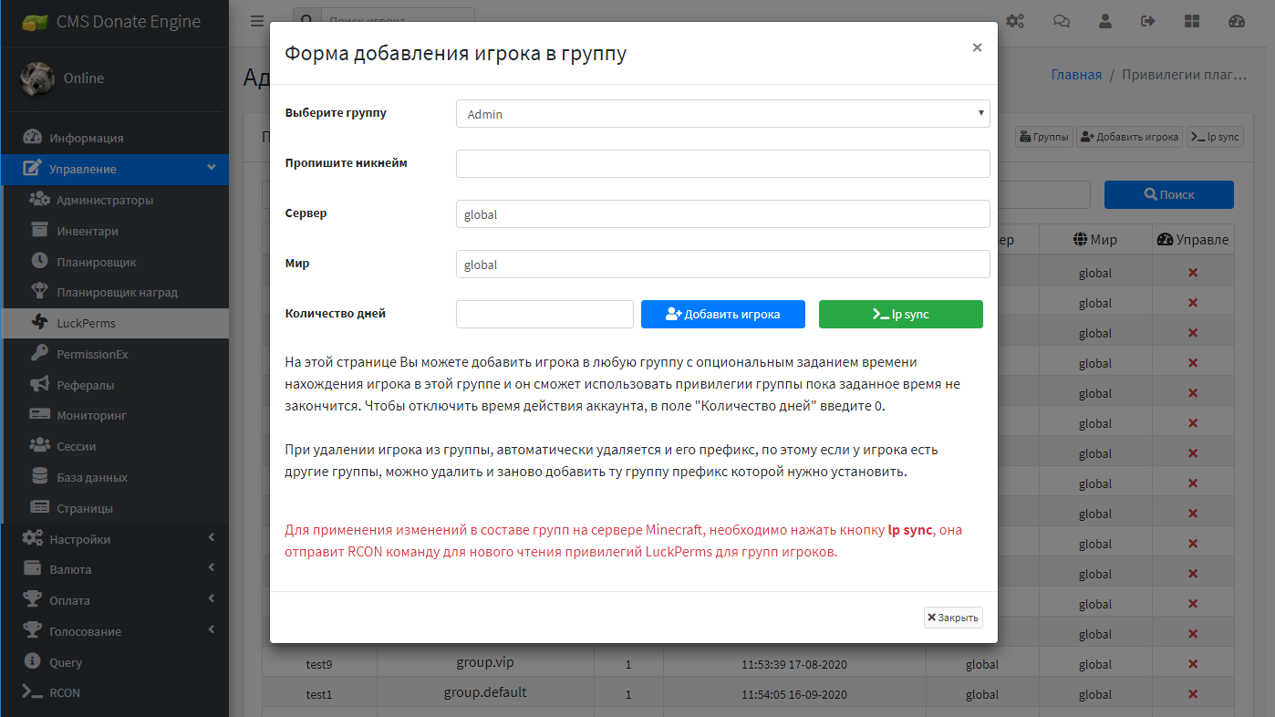 To connect the plugin to the CMS Donate Engine, you need in the server settings shop/admin/?page=management to specify the database connection LuckPerms and in the setting of sales teams shop/admin/?page=groups from the drop-down list select the plug-in connected to the server.