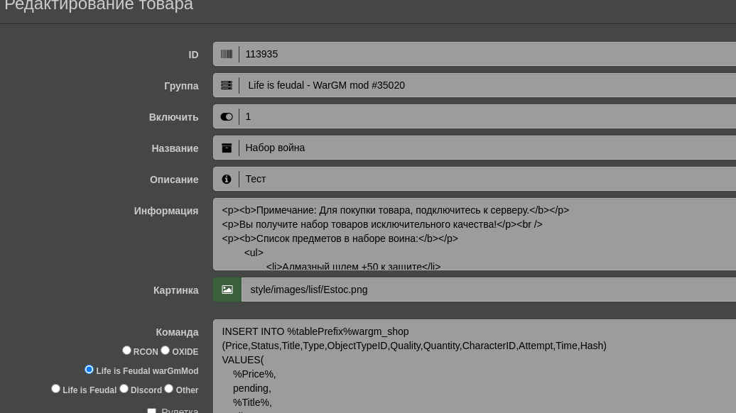 Added experimental support for donat for List servers with the Warz mod, which issues goods through the MySQL database. To enable the List in the server settings, enter the store sets module.