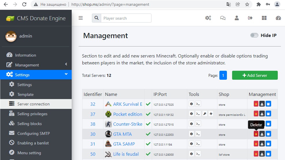 The server deletion function has been updated in the admin panel. Now, when deleting, tables with products are cleared. Cleaning of goods is needed to import the dump file with the server.
