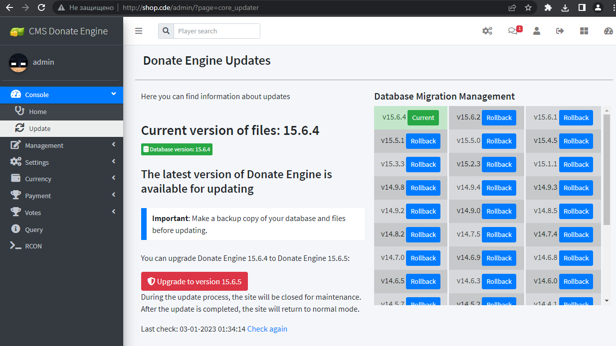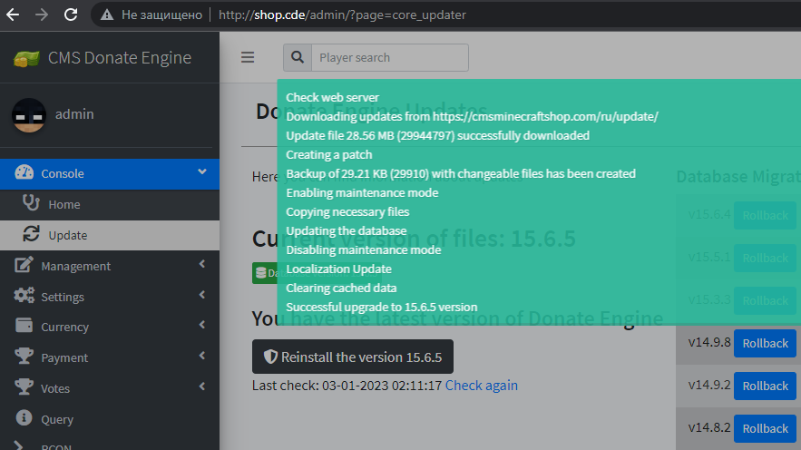 An automatic update feature has been added to the admin panel. Added new RCON protocols for server management. Added migration management. During the update, a backup archive with changeable files is created.