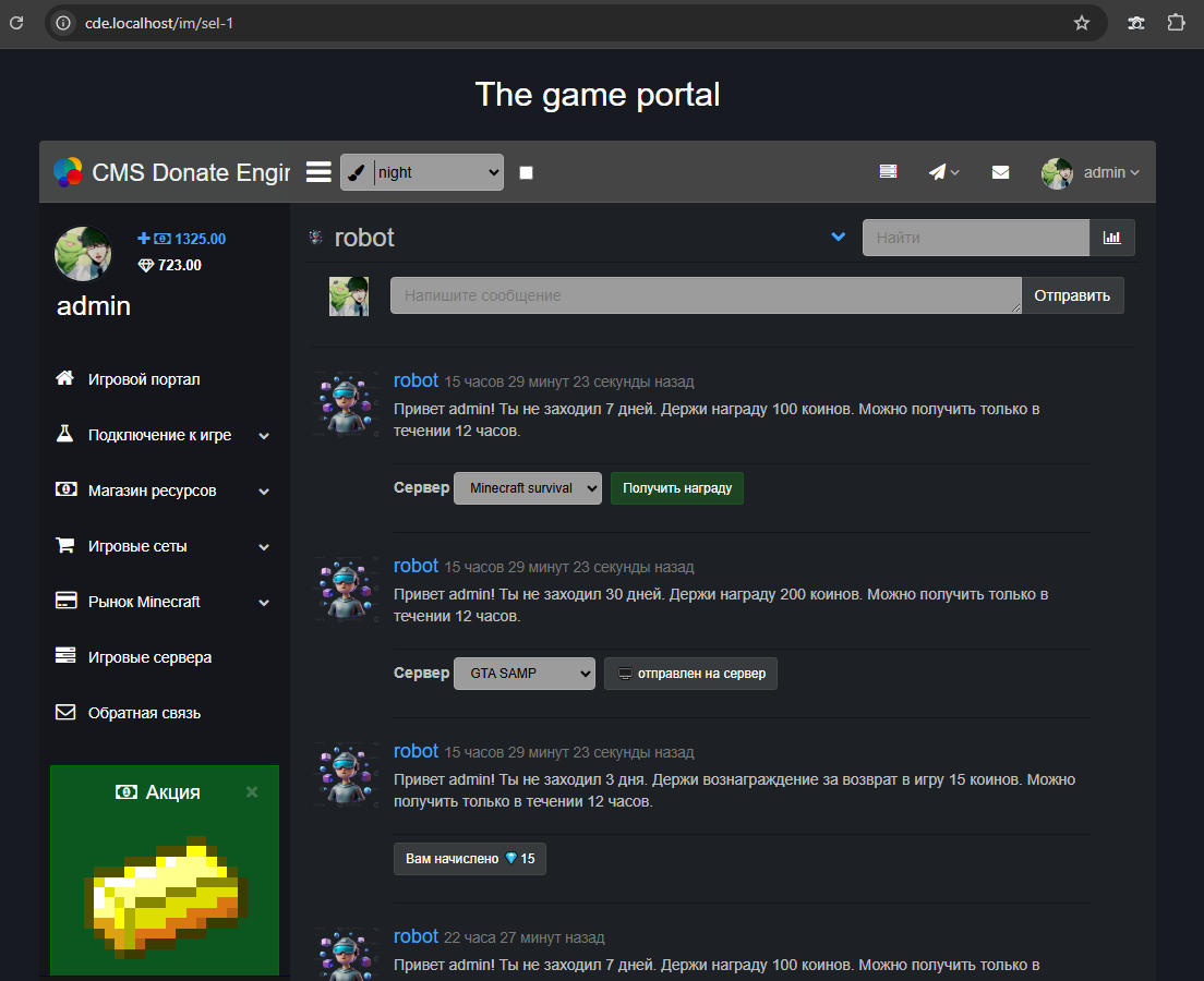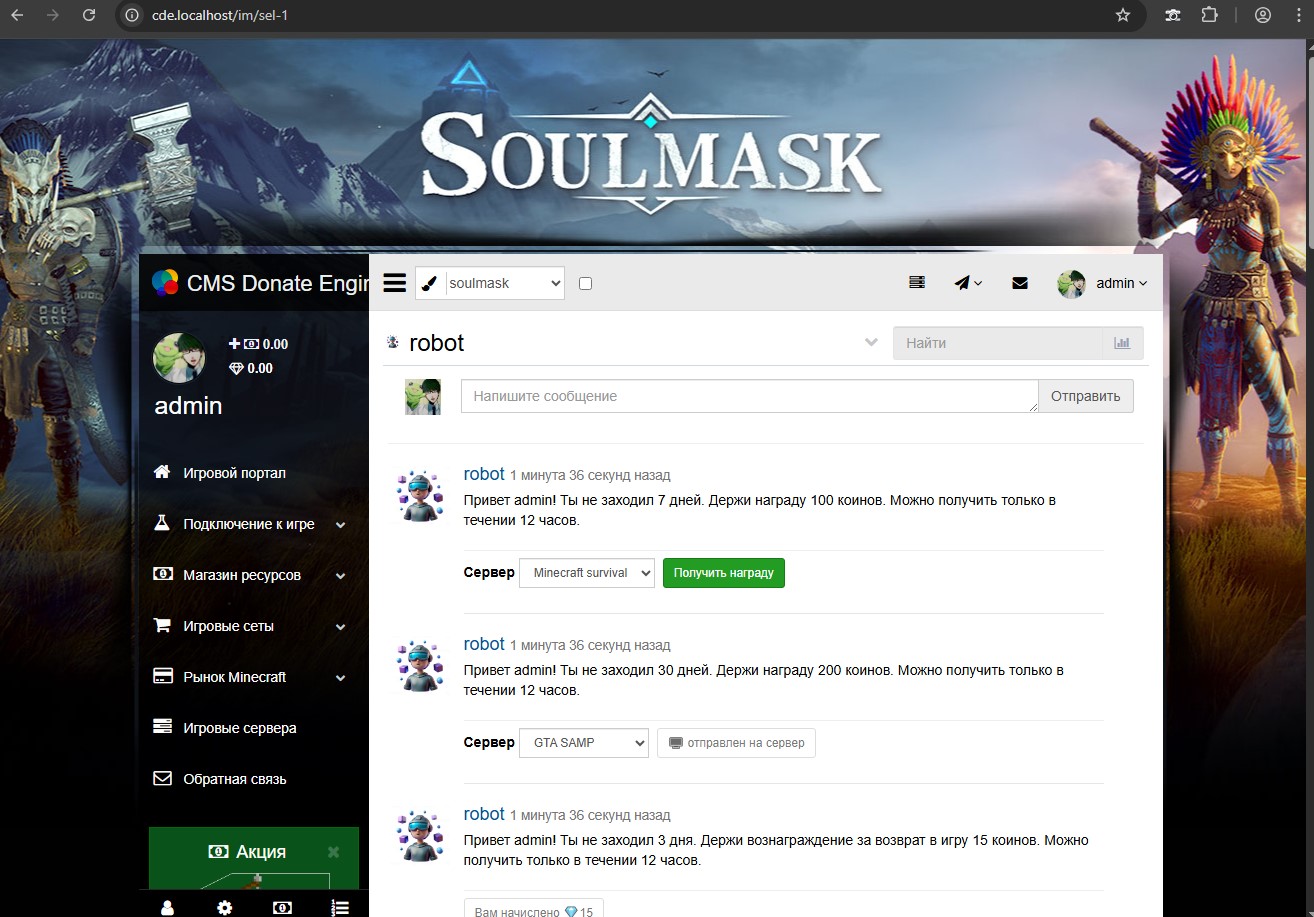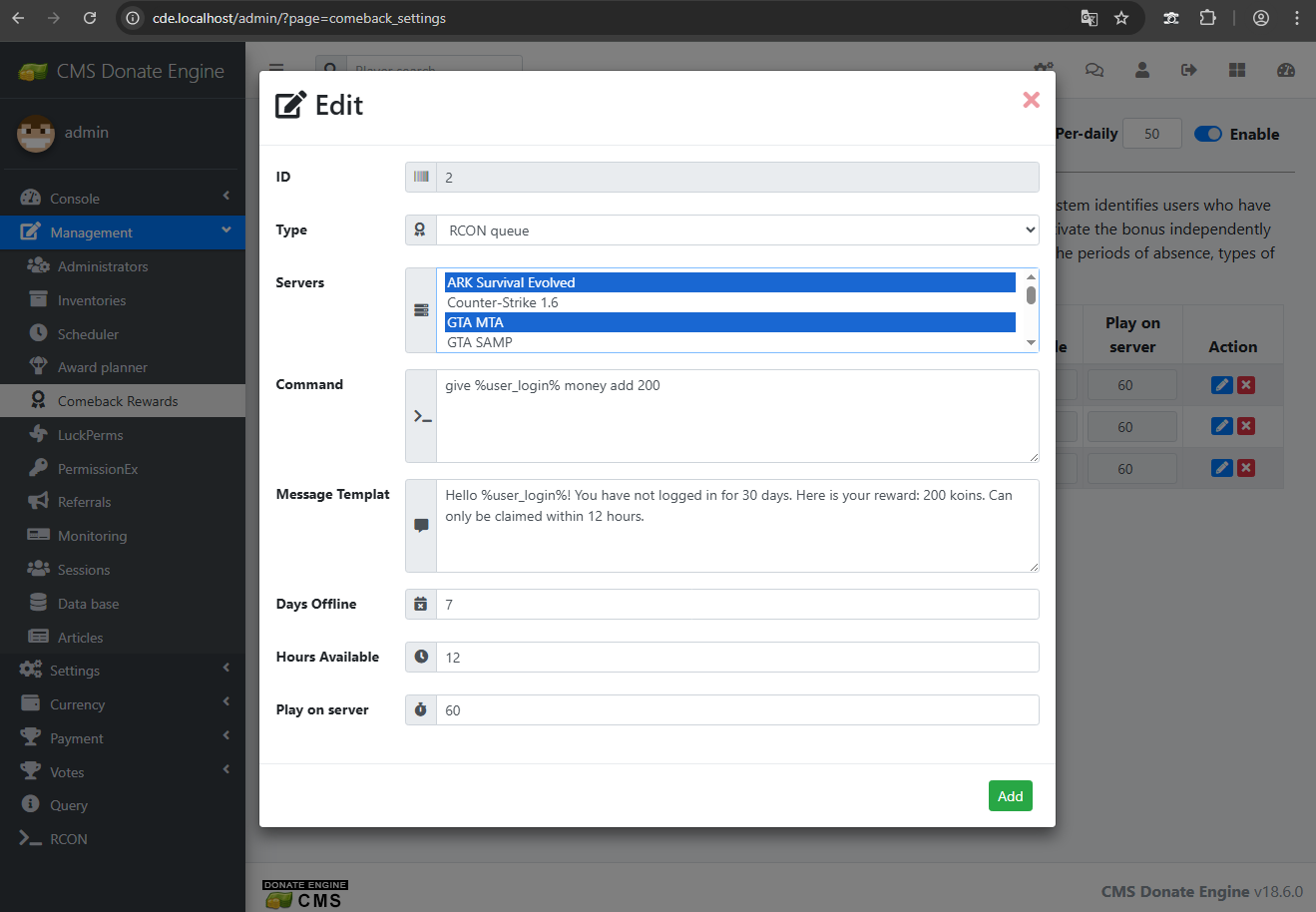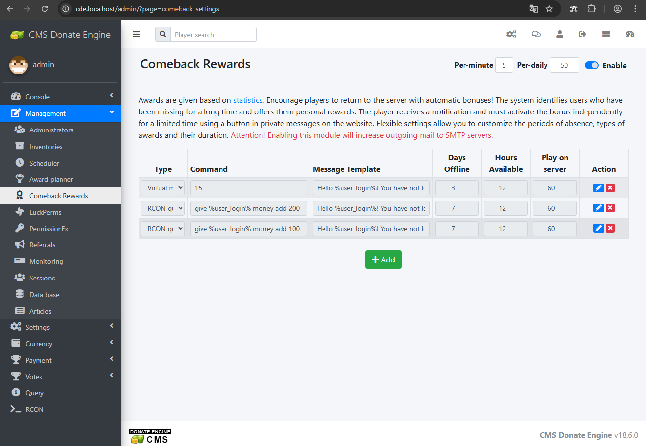 The player refund module has been added: the system analyzes statistics and automatically sends personal bonuses to those who have not logged on to the server for a long time. The player receives a notification with a time limited offer - to activate the reward, just click the button. Flexible settings allow you to choose the periods of absence, types of rewards and their duration, making the return of players easy and profitable.