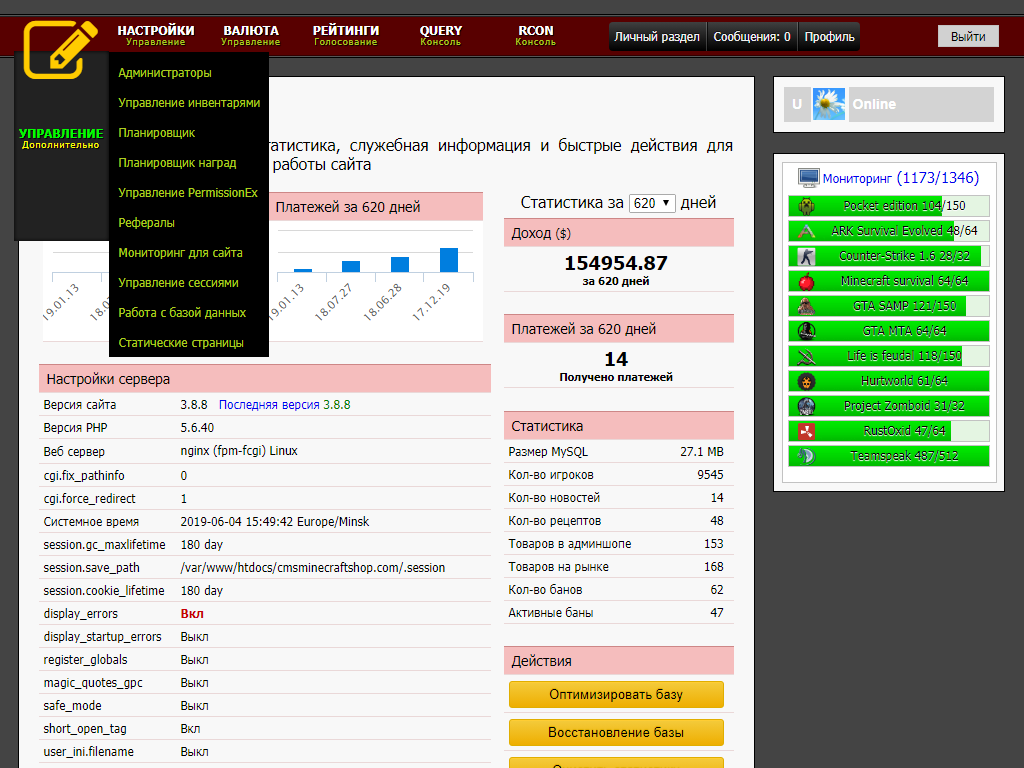 Updated administrator menu, icons Font Awesome are used instead of images. Updated list of the effects in the file items.json for minecraft servers.
