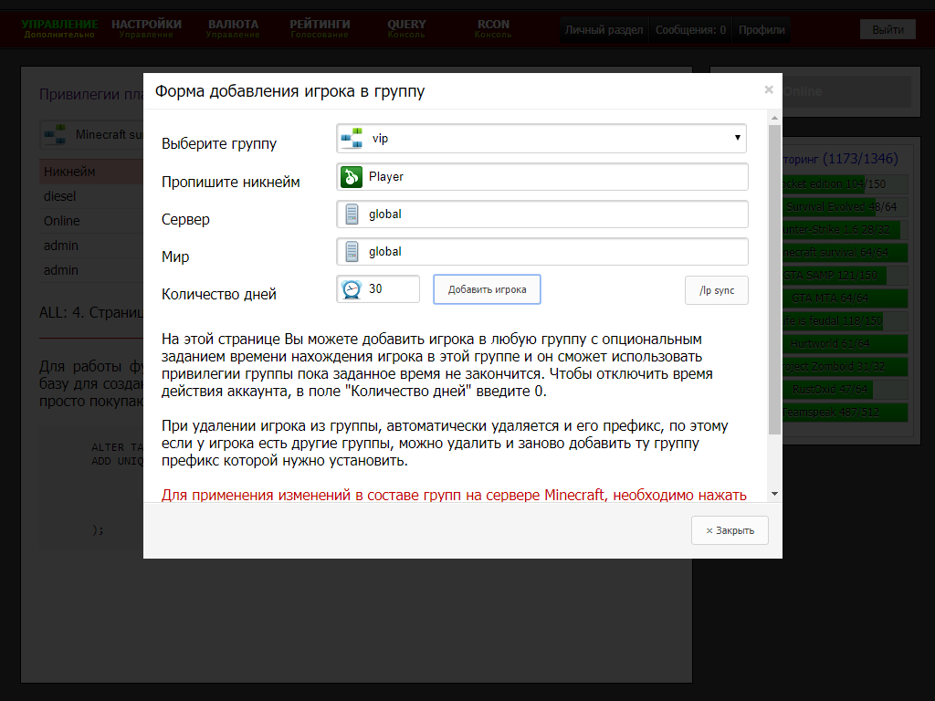 ALTER TABLE `ms_servers` ADD `luckperms` TEXT CHARACTER SET utf8 COLLATE utf8_general_ci NOT NULL AFTER `perm`; ALTER TABLE `ms_groups` ADD `mod` VARCHAR(15) CHARACTER SET utf8 COLLATE utf8_general_ci NOT NULL DEFAULT 'pex123' AFTER `rcon`;The file with the changes: