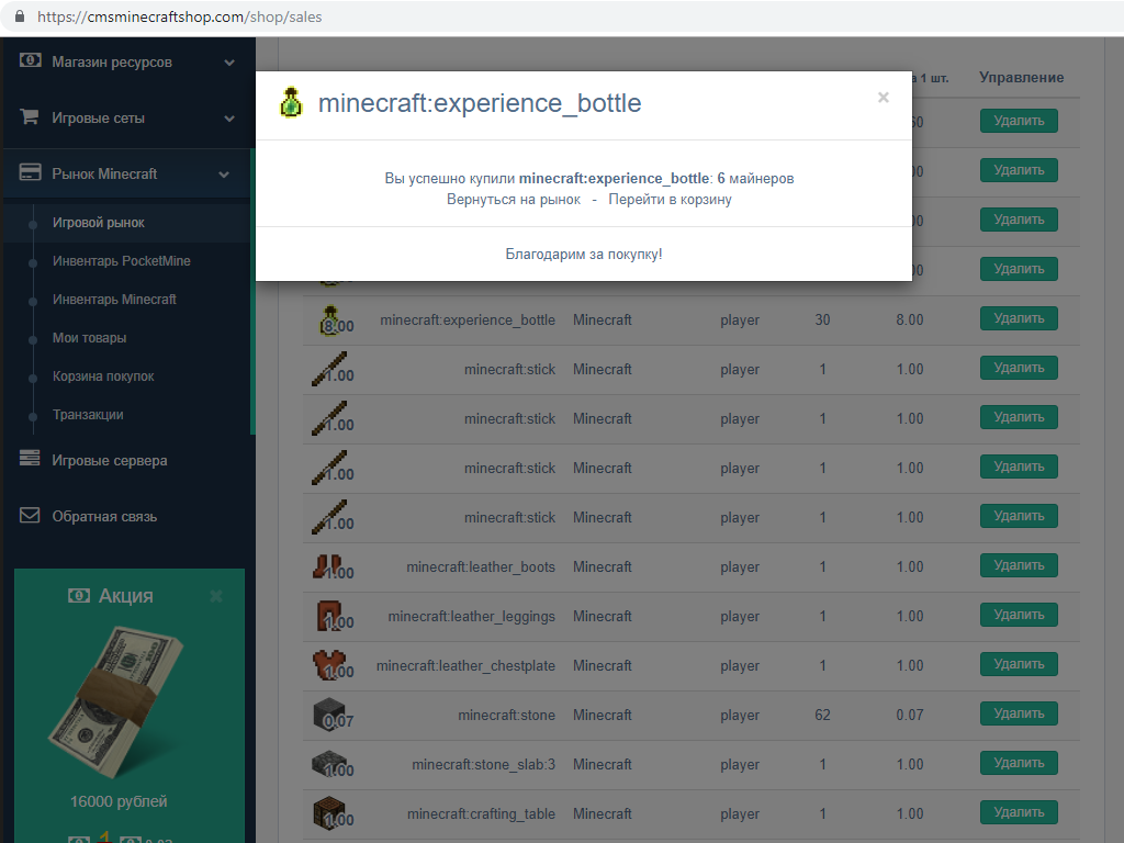 Improvement module market Minecraft, added a new modal window in some events. Added option define('IGNORE_DISABLED_MARKET', true); including the sale of any resource on the Minecraft market.