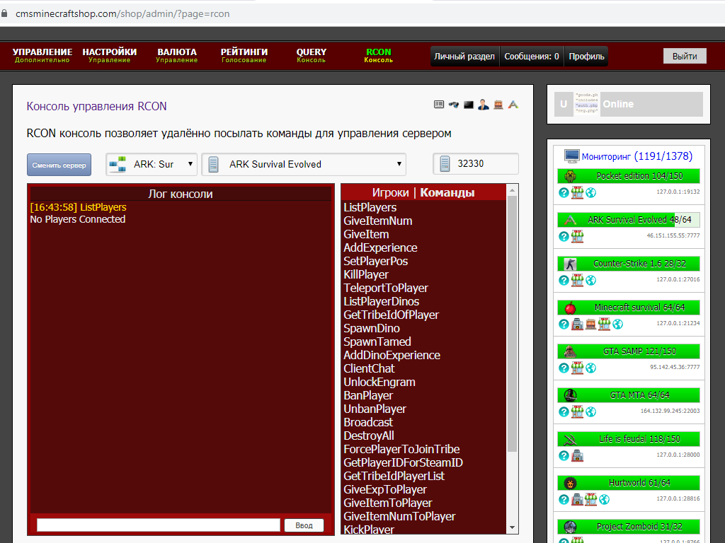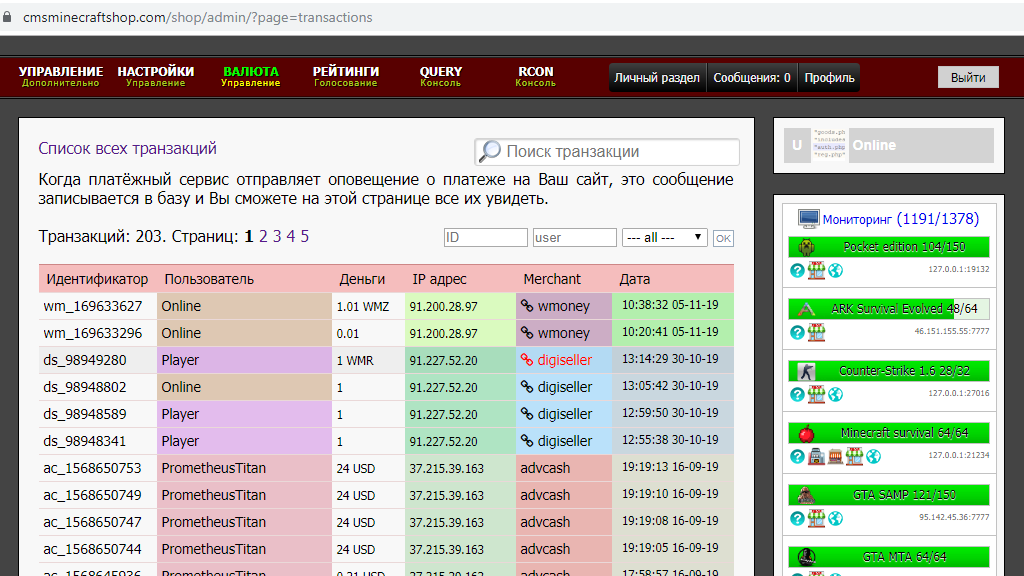Fix save data function in MySQL session when user logs out. Improvement of rcon console module, top-up list and WebMoney.