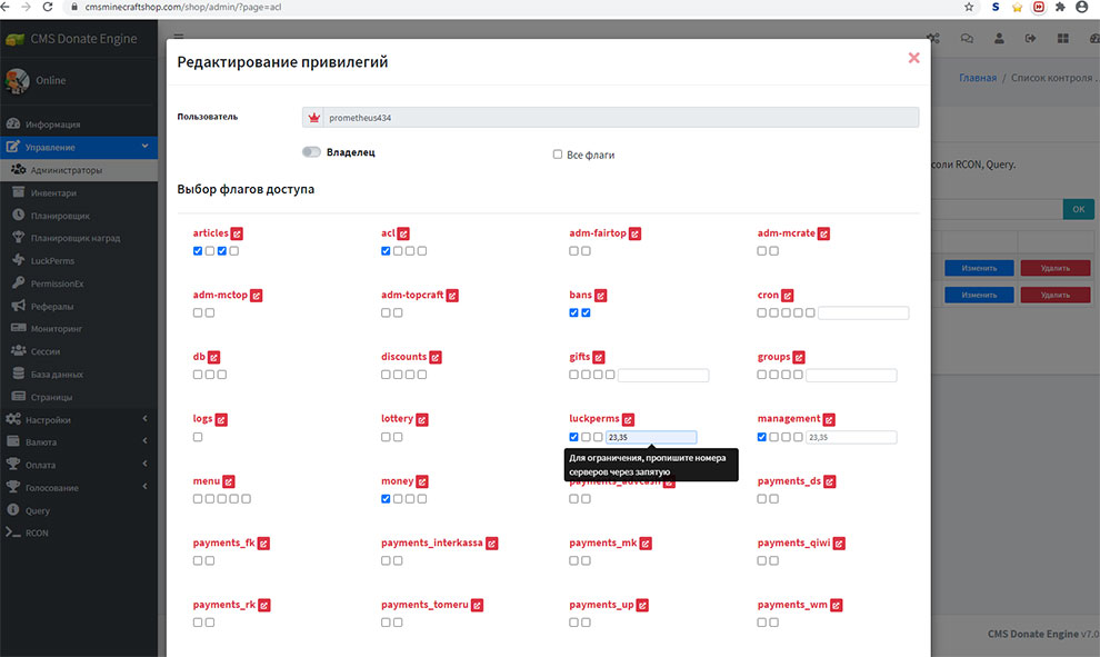 An extended access control system has been added to the privilege settings for assigning administrators to individual servers. Removed the request to the MySQL server to get administrator privileges. Privileges are written to the user session to speed up work.