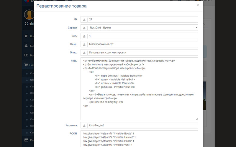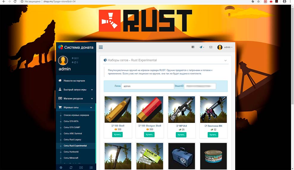 To connect the PHP script donate shop to the servers of RUST in the admin CMS Donate Engine, set up the connection to the server and the module sets sales set items that will be sold.
