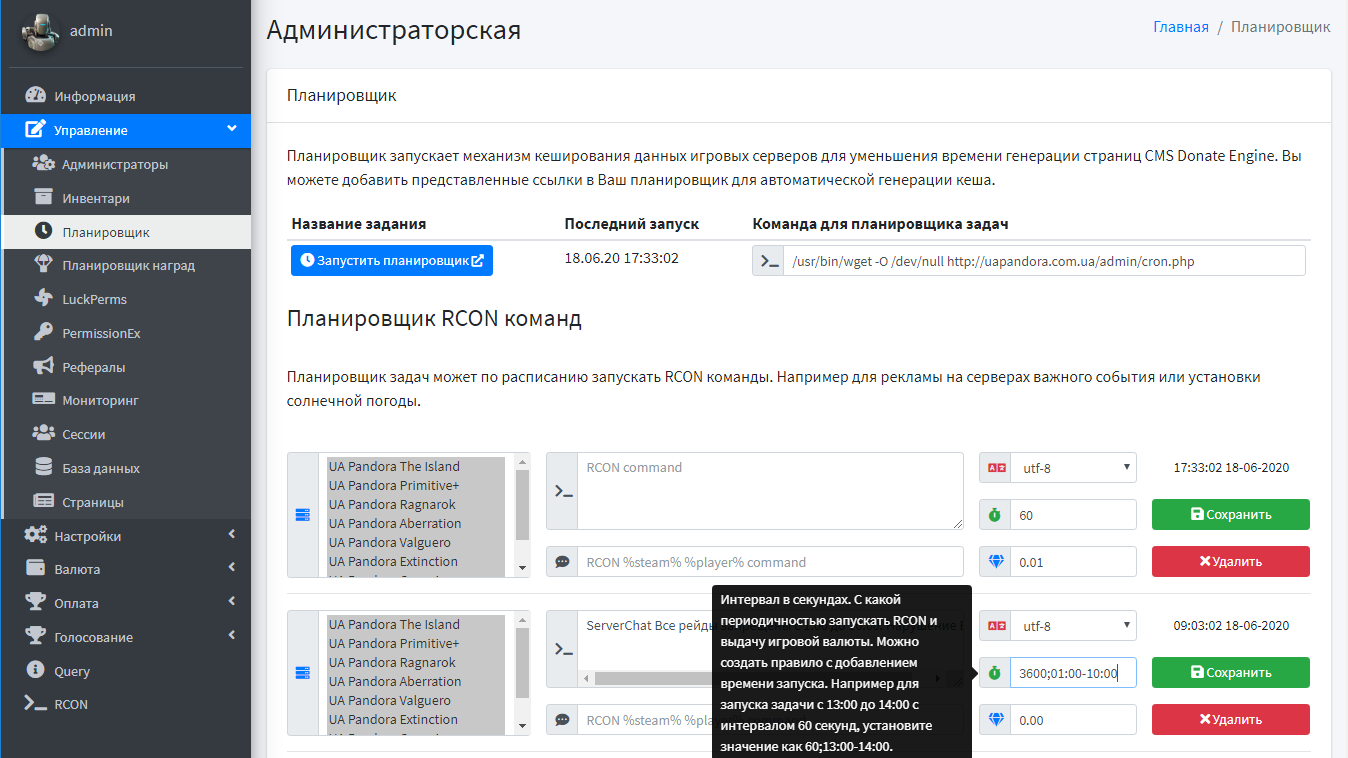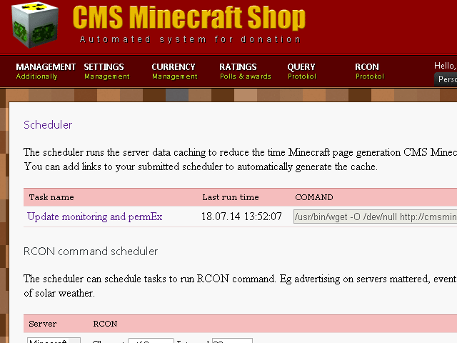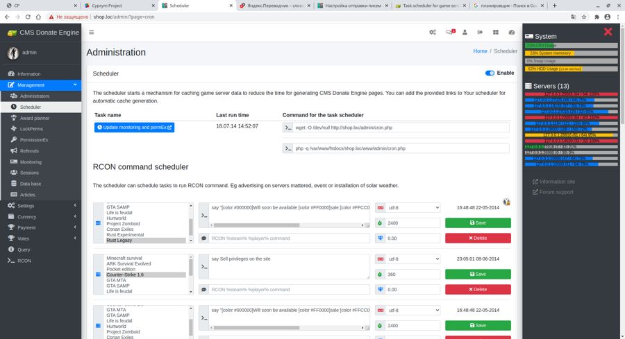 CMS Donate Engine is designed for independent scheduler (Game WEB Scheduler), which manages data caching mechanism to monitor servers Steam and OXIDE. Along with caching mechanism also works, and a dedicated scheduler that runs the necessary commands for servers through remote protokol RCON.