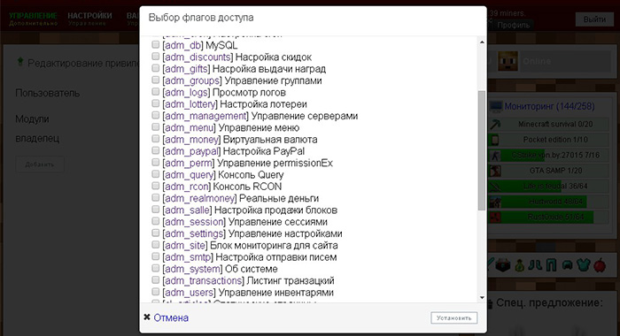 The built-in privileges that are available to file individual flags to the admin and to the user interface by the moderator. Work on the website in the team! Delegate his authority to the most casual players. Assign new moderators to manage servers and configuration in economy!