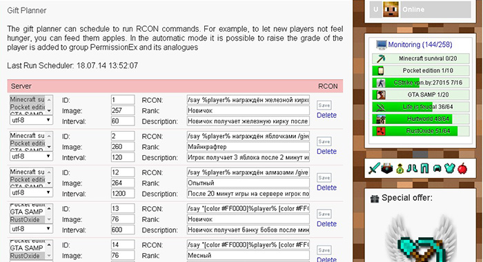 A built-in scheduler runs scheduled RCON commands. For example, sometimes we need to reward those who are not playing on the server or on the servers of important events, installing solar weather or a reboot of the server to improve the stability of the server.