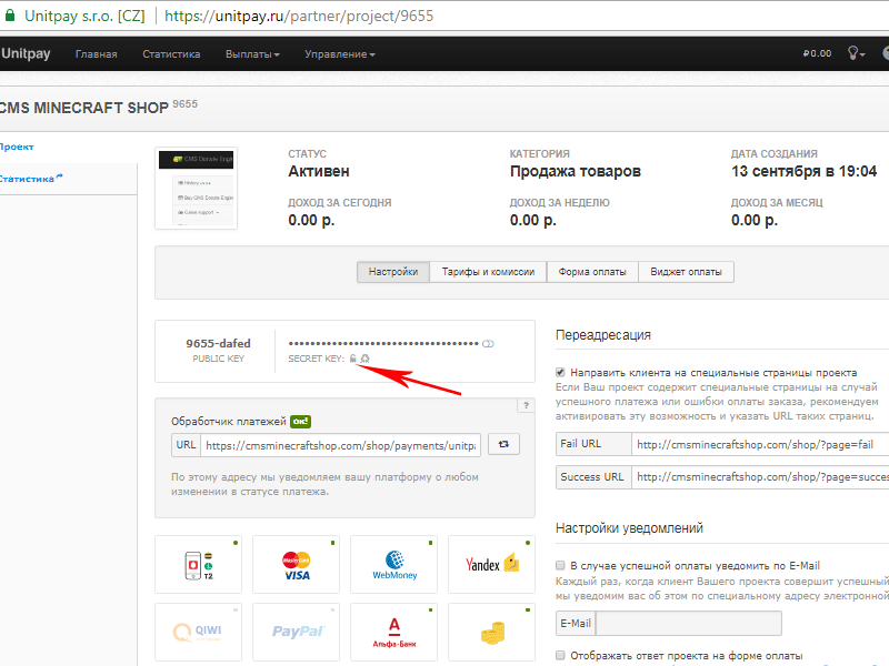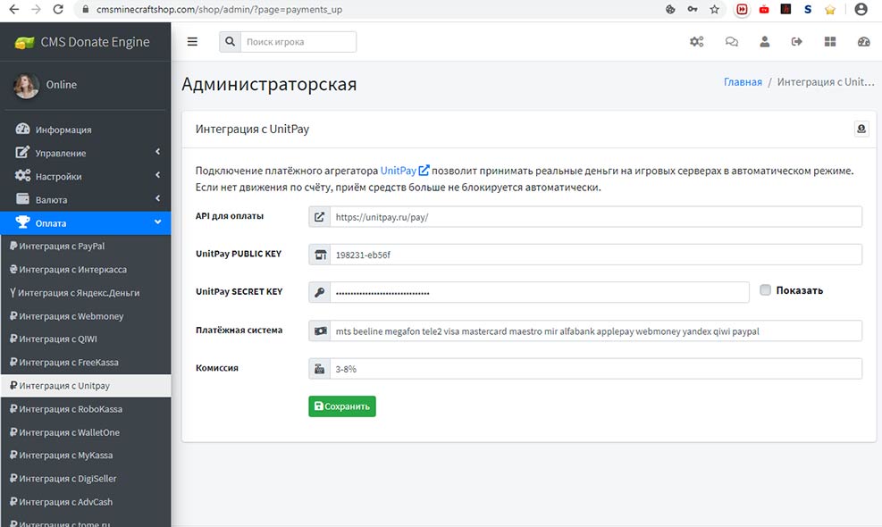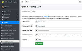 To accept funds from payments aggregator Unitpay on your site, go to the admin panel, list the options for integration with the service Unitpay. The site Unitpay, select the appropriate options as presented on the screenshot.