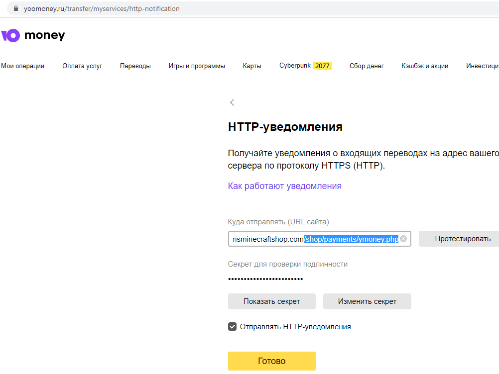 To connect to the Minecraft store payment system Yandex money, go to the admin panel and mount your purse with the installation payment notification and the code word to be used to monitor all transactions. After setting, when you receive a payment notification, the player is awarded money that he can use immediately.