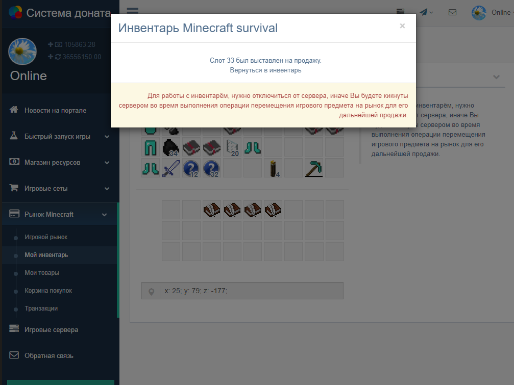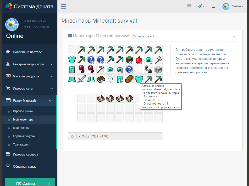 Работа с файловой структурой серверов Minecraft, включая самые последние версии. На Вашем сайте, с помощью PHP скрипта для игроков станут доступны операции доната с инвентарём, они смогут перемещать предметы в свой инвентарь и администраторы получат возможность проверять инвентари, удалять предметы, устанавливать или удалять режим креатив и даже когда игроки отключаются от сервера.