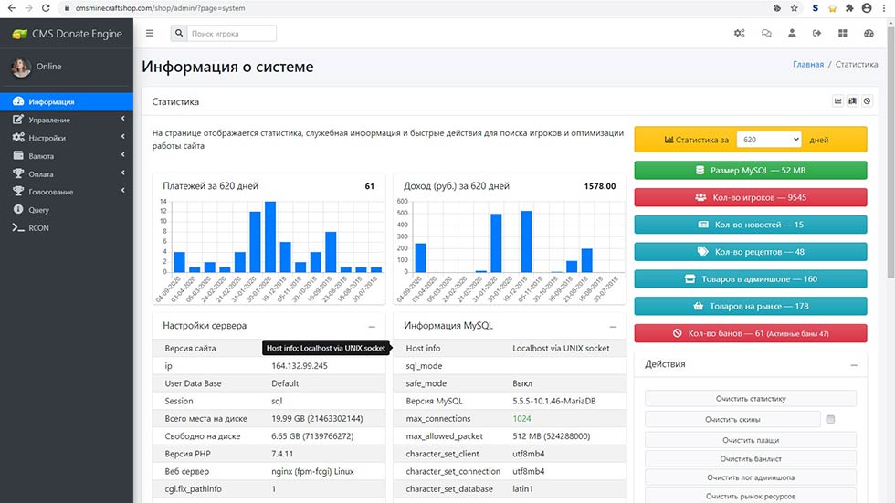Удобное управление всеми серверами в одном месте. Поддерживается множество популярных протоколов, сервера Steam и OXIDE. Можно использовать для выдачи ресурсов, для разбана игроков или просто для проверки параметров сервера без входа в игру.Подлключение игровых серверов Minecraft к CMS Donate Engine