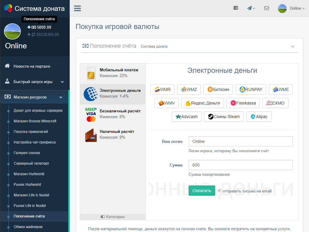 Обновлён модуль приёма пожервований от игроков, добавлены категории для оплаты с кнопками доната. Теперь можно принимать Яндекс.Деньги, Webmoney, QIWI, PayPal напрямую с отключением их в других платёжных агрегаторах.